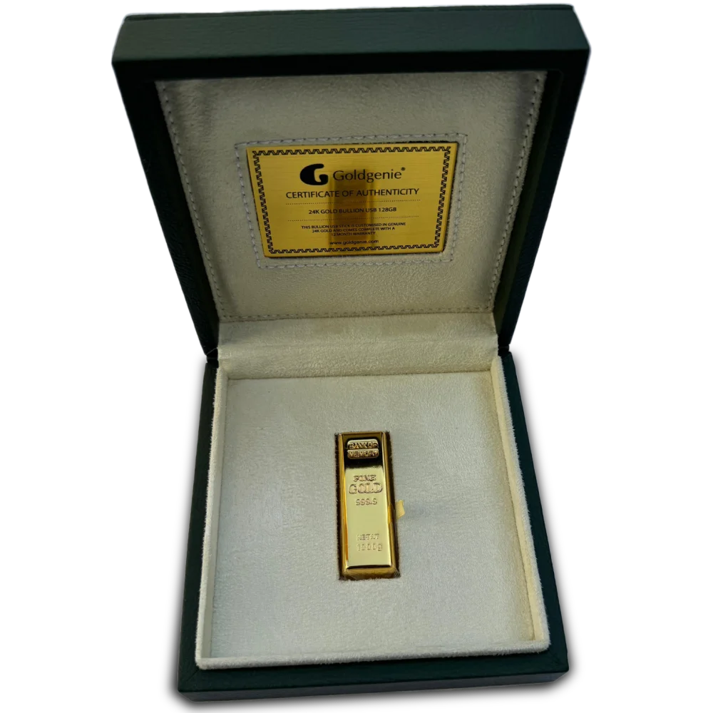 This Gold Bullion 128GB style USB Stick is customised by Goldgenie in pure 24k Gold.