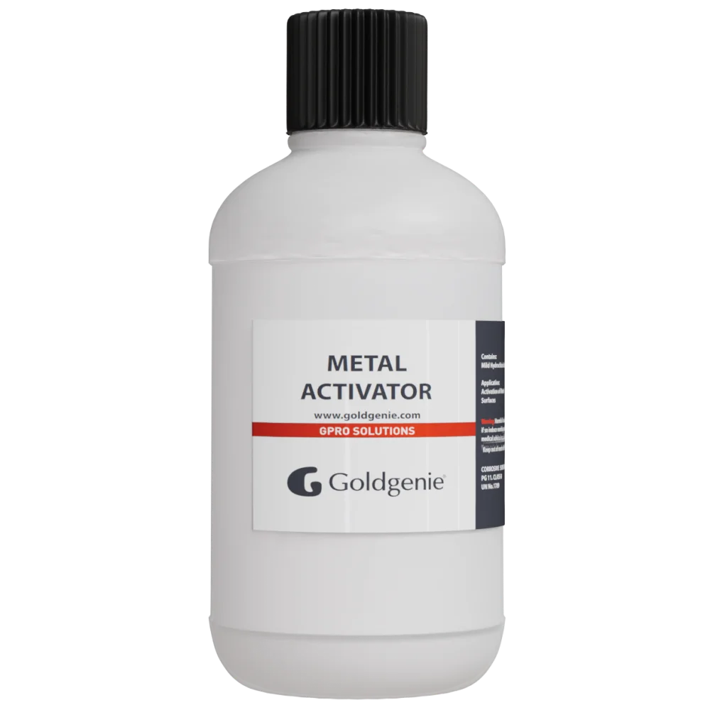 Metal Activator, used just before plating of Stainless steel or Nickel, activates to create surface ready for extreme bonding of gold to metal. Supplier to the brush plating industry since 1995. Guarantee your work for longer - use Goldgenie chemicals!